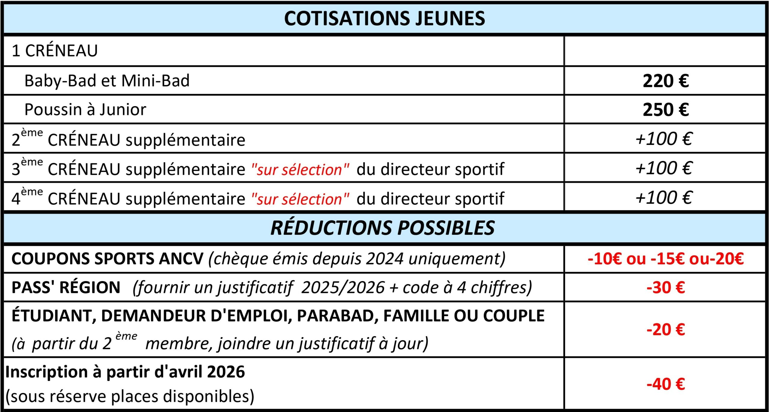 Voici le prix des cotisations jeunes pour la saison 2025/2026 :