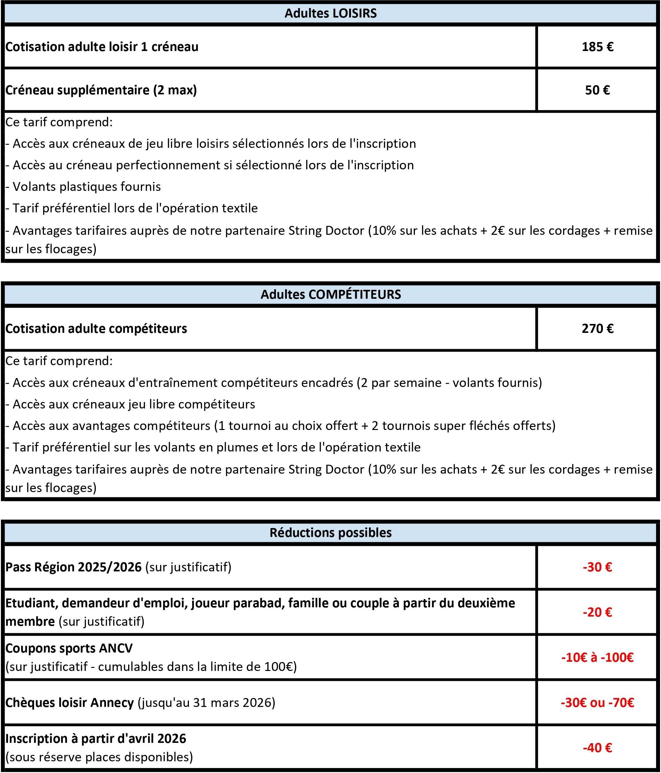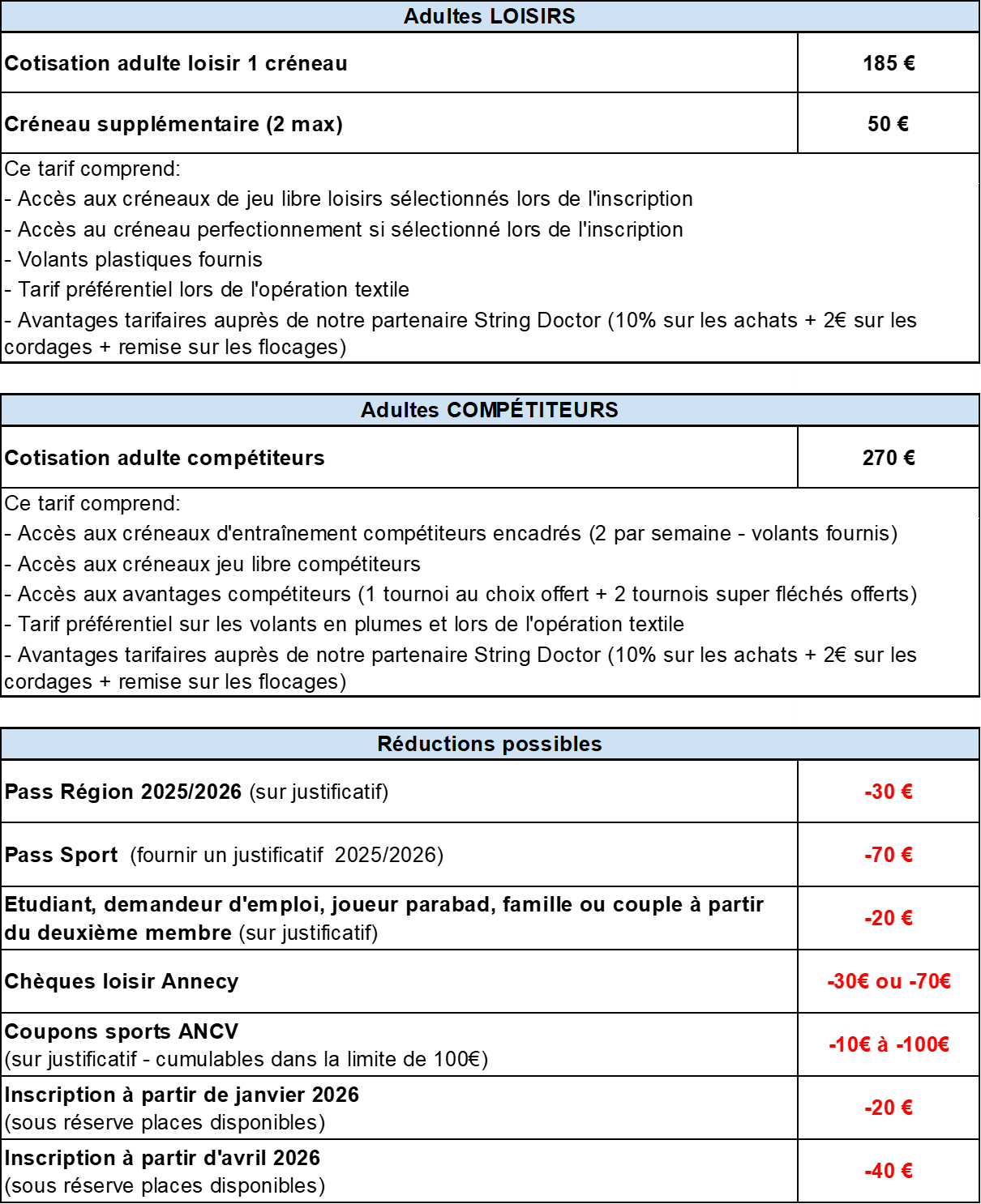 Une réduction de 10€ sur la grille ci-dessus est appliquée à nos adhérents pour tout renouvellement d’inscription réalisée entre le 1er et le 31 juillet.